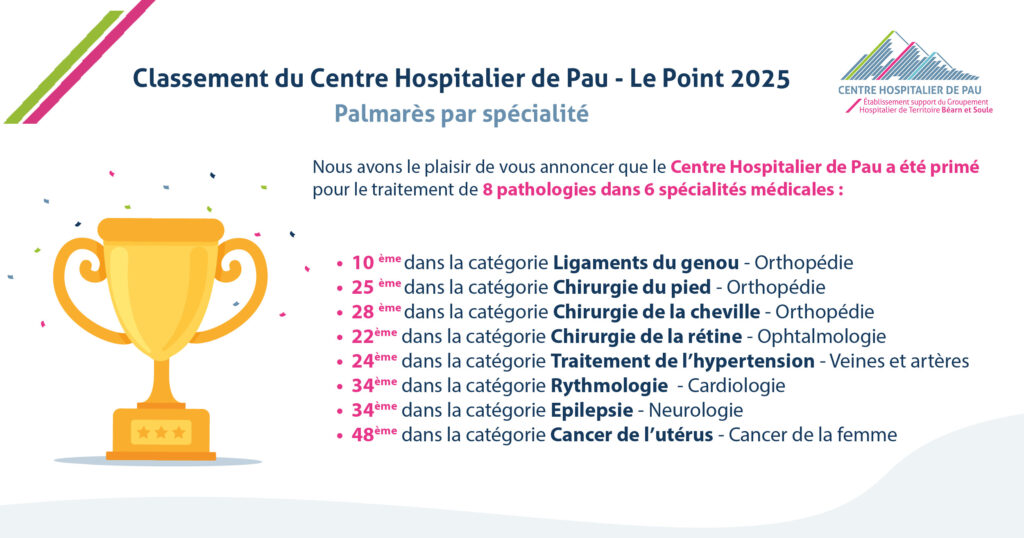 🏆 Le Palmarès des Hôpitaux 2025 du magazine Le Point, basé sur les données d’activité 2024, met une nouvelle fois à l’honneur l’engagement et l’expertise des équipes du Centre Hospitalier de Pau.