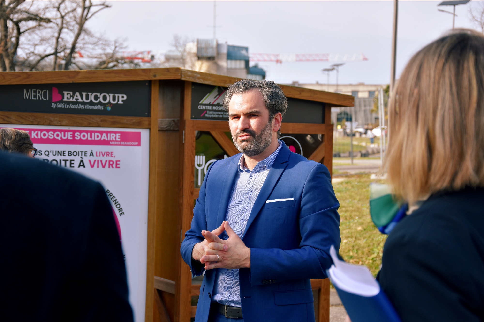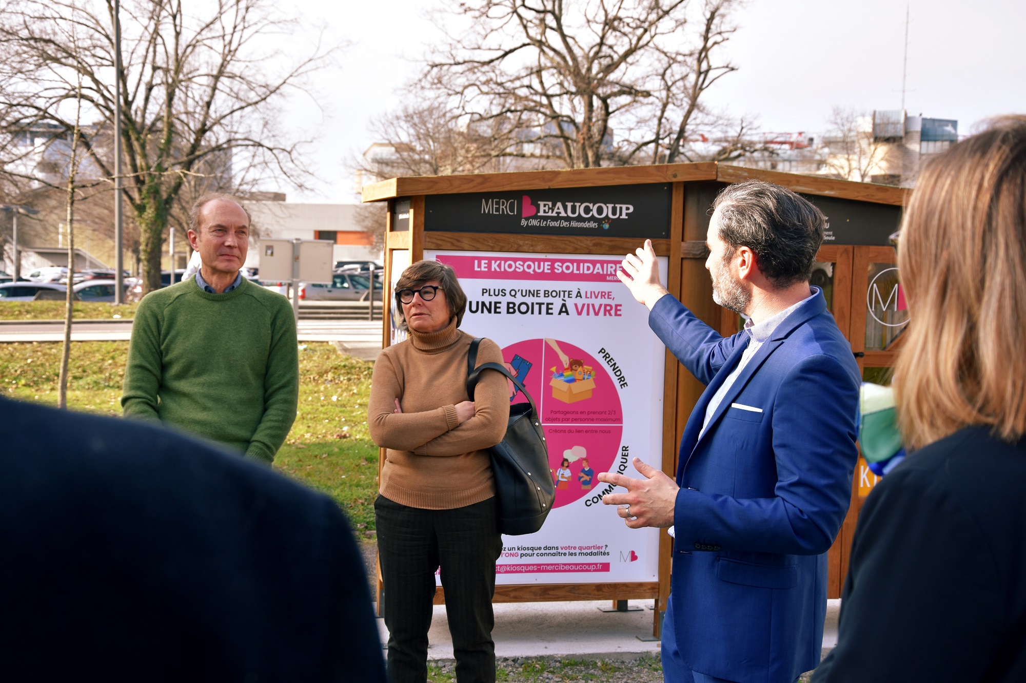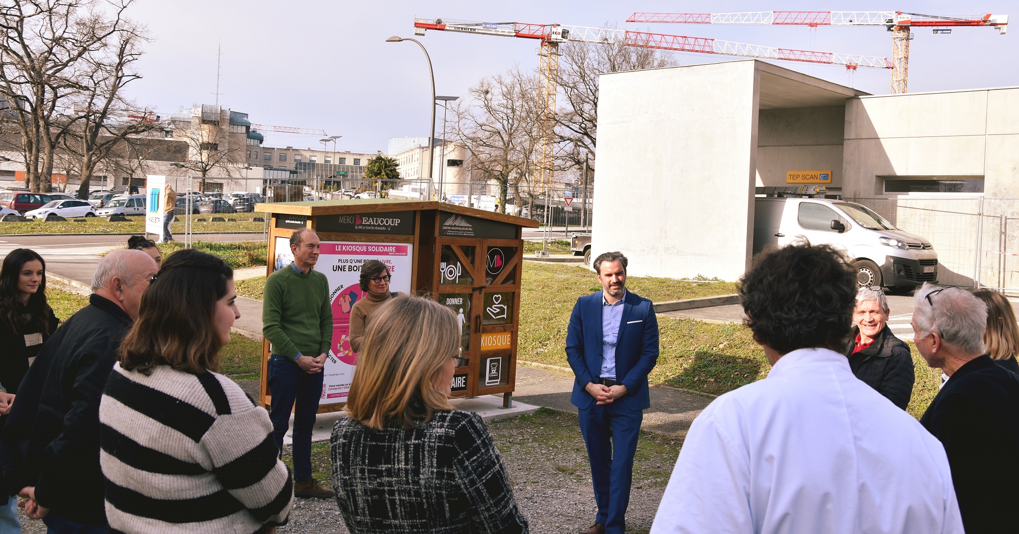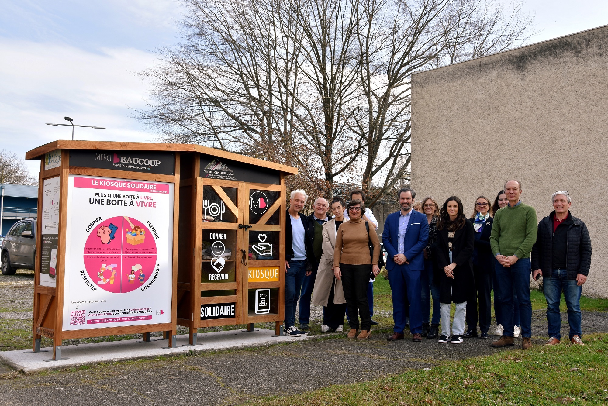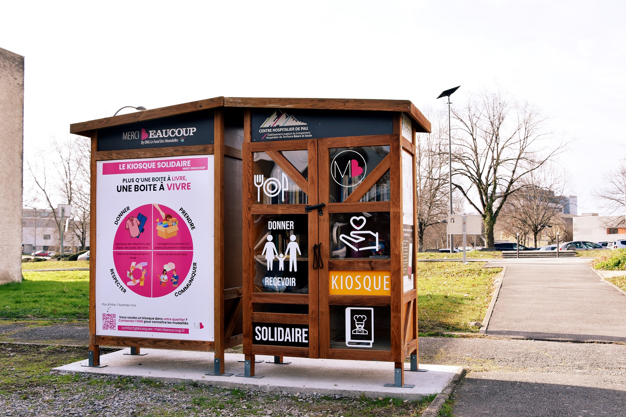 Dans un souci de solidarité citoyenne, le Centre Hospitalier de Pau a souhaité accorder au Kiosque Solidaire un emplacement pertinent pour ses futurs utilisateurs, à savoir à proximité immédiate de ses bâtiments pouvant recevoir des populations dans le besoin.